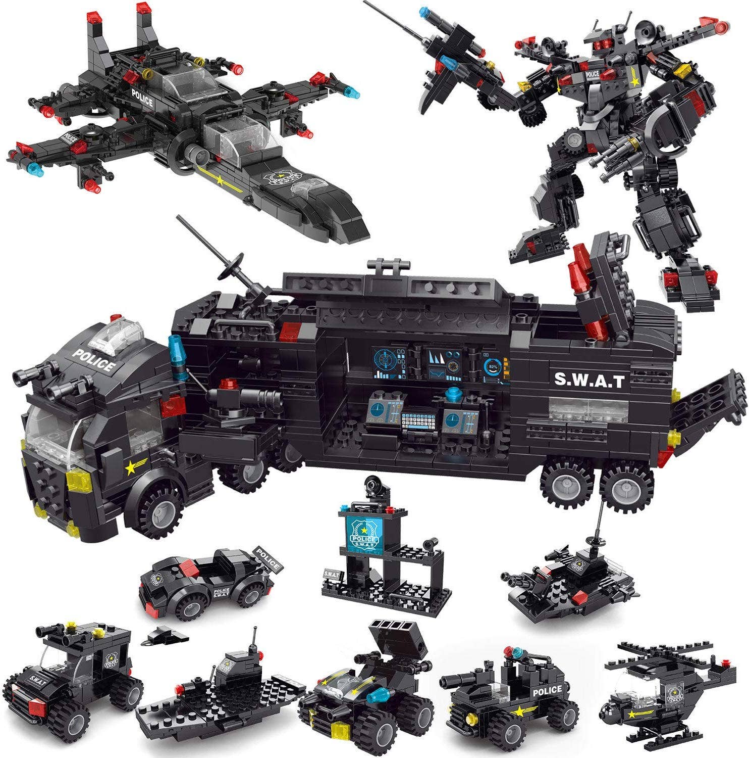 The ultimate 8 in 1 military command center building set for kids. The total set features 700 building bricks, each with its own illustrated instructions. Combine all sets to Build 3 different police vehicles or create a giant police truck with all 700 bricks.