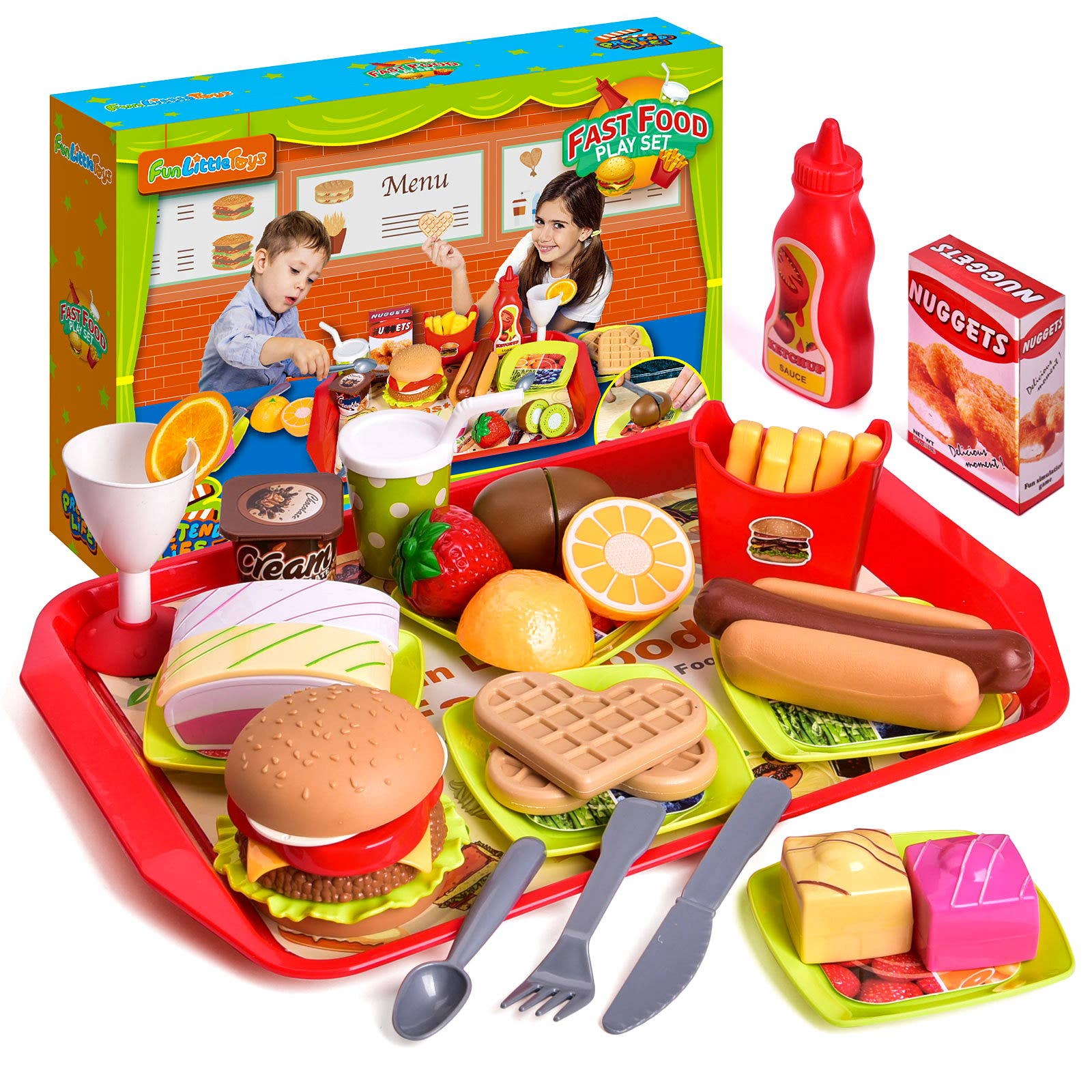 Rich varieties of realistic fast food playset include an American style hamburger, a sturdy tray, a mouthwatering hotdog, tasty desserts, heart-shaped waffles, tomato ketchup, french fries, fresh fruits, cutleries…etc. 40 pieces altogether.
