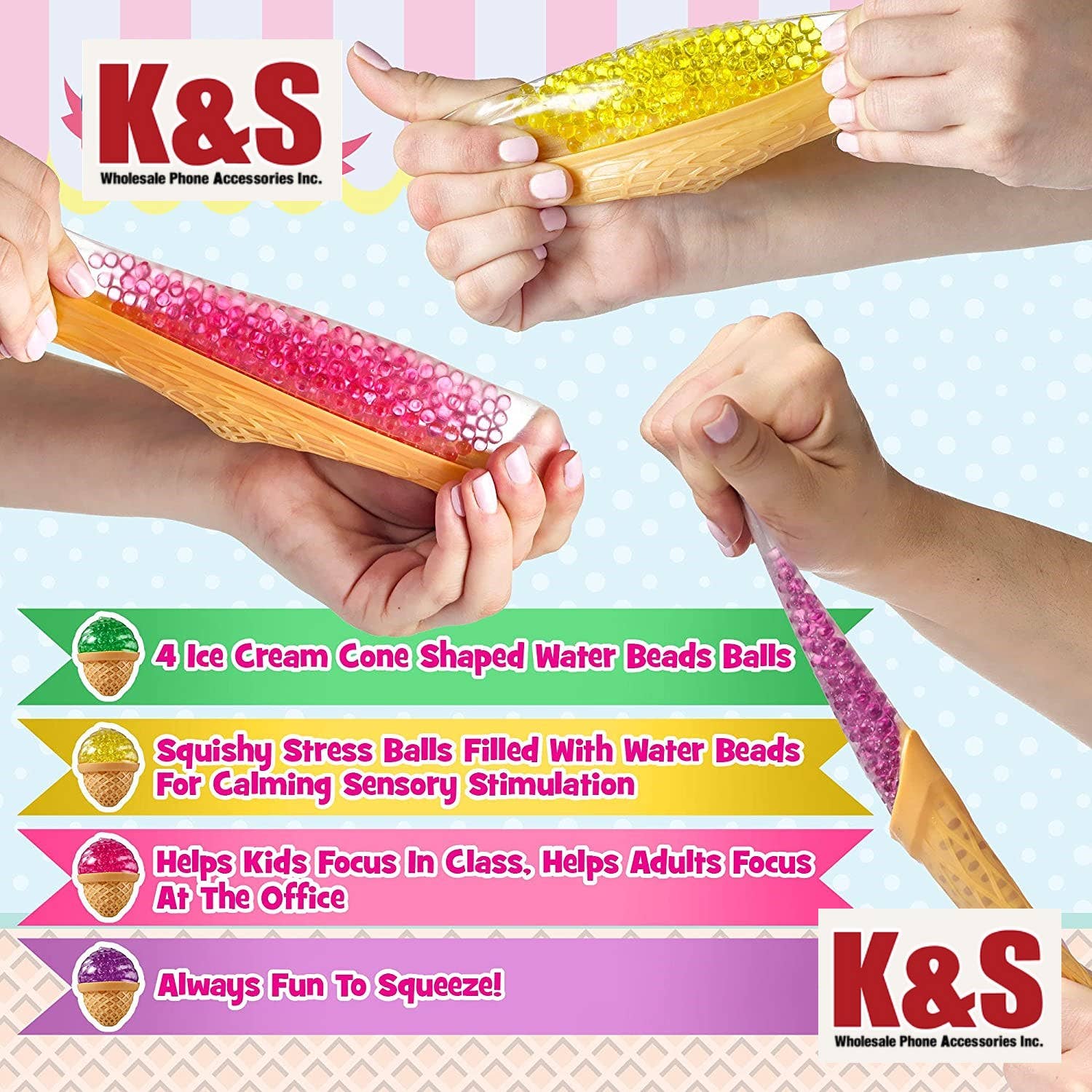 BANISH YOUR STRESS: Take a deep breath and let our Ice Cream Cone Squishies lead you to a state of calm. SOOTHING AND SATISFYING: Whether at home, school, or work, these squishy cones are the ultimate anxiety-fighting tool. Made with hundreds of water beads, they have a soft and sticky texture that's oh-so-addictive to squeeze. PERFECT FOR SENSORY THERAPY: These squeeze toys are not only fun, but they also make great sensory tools for children with autism. They can also provide calming relief for adults with anxiety or serve as fidget toys for anyone needing a moment of relaxation. DURABLE DESIGN: Our goal is to create products that bring joy for a long time to come. That's why our Ice Cream Cone Squishies are made with high-quality materials that