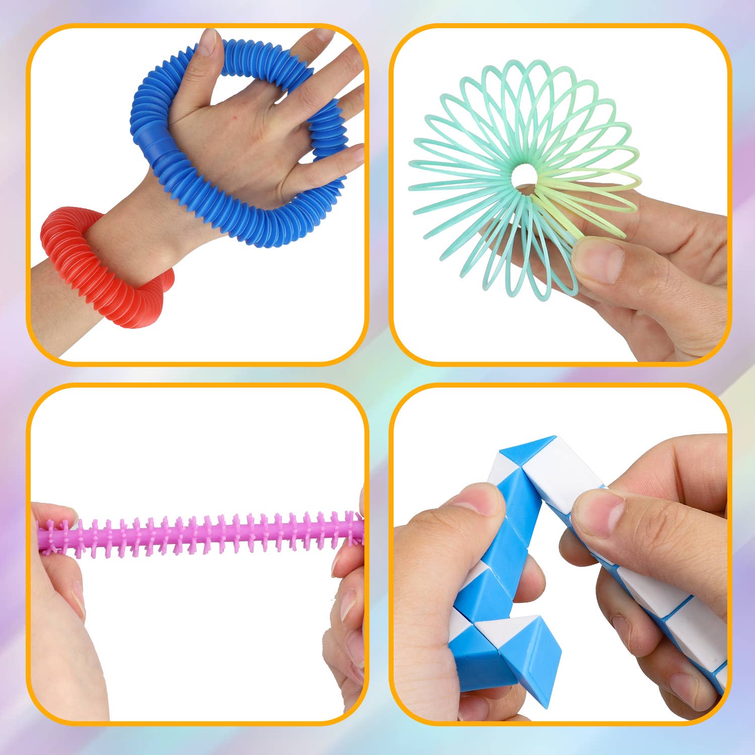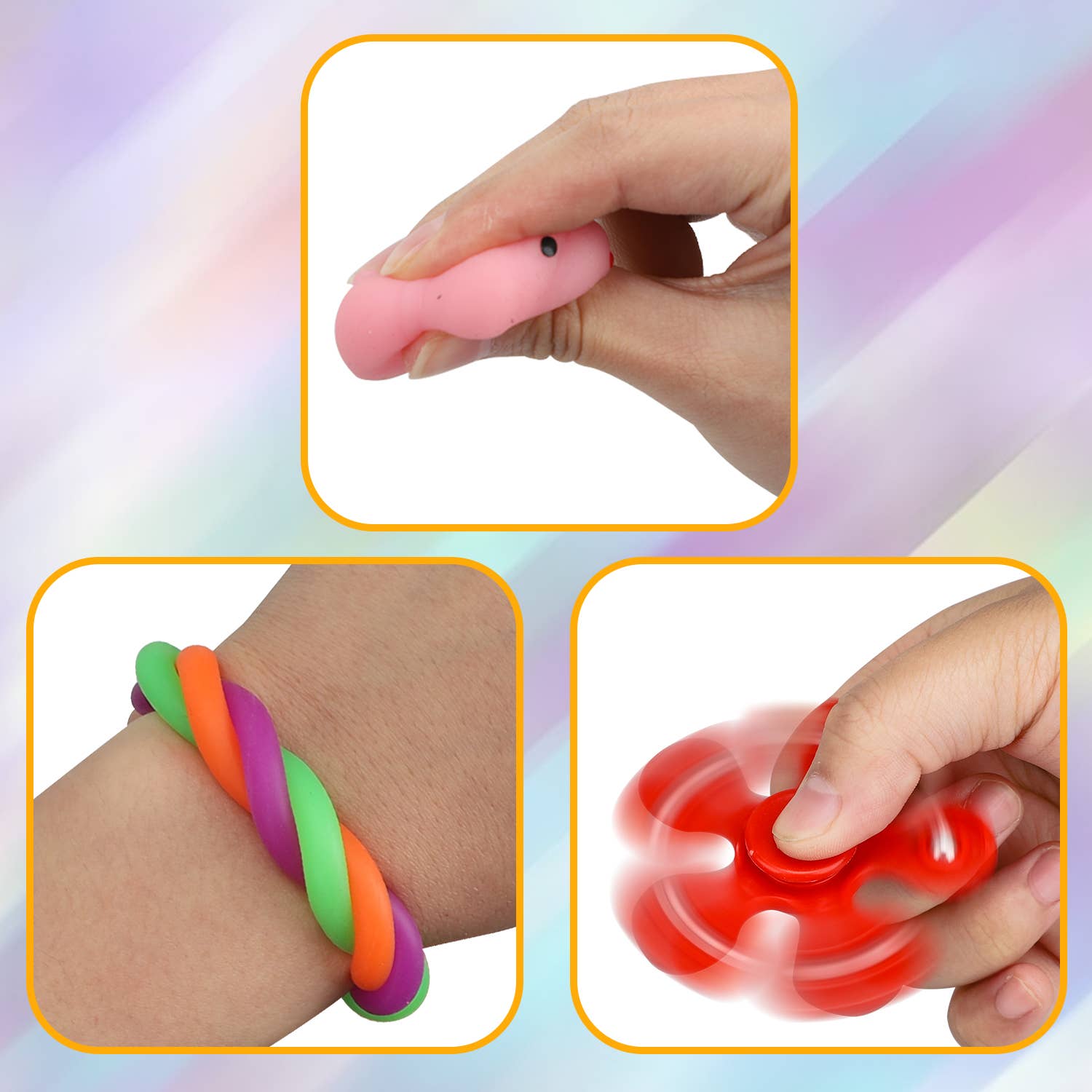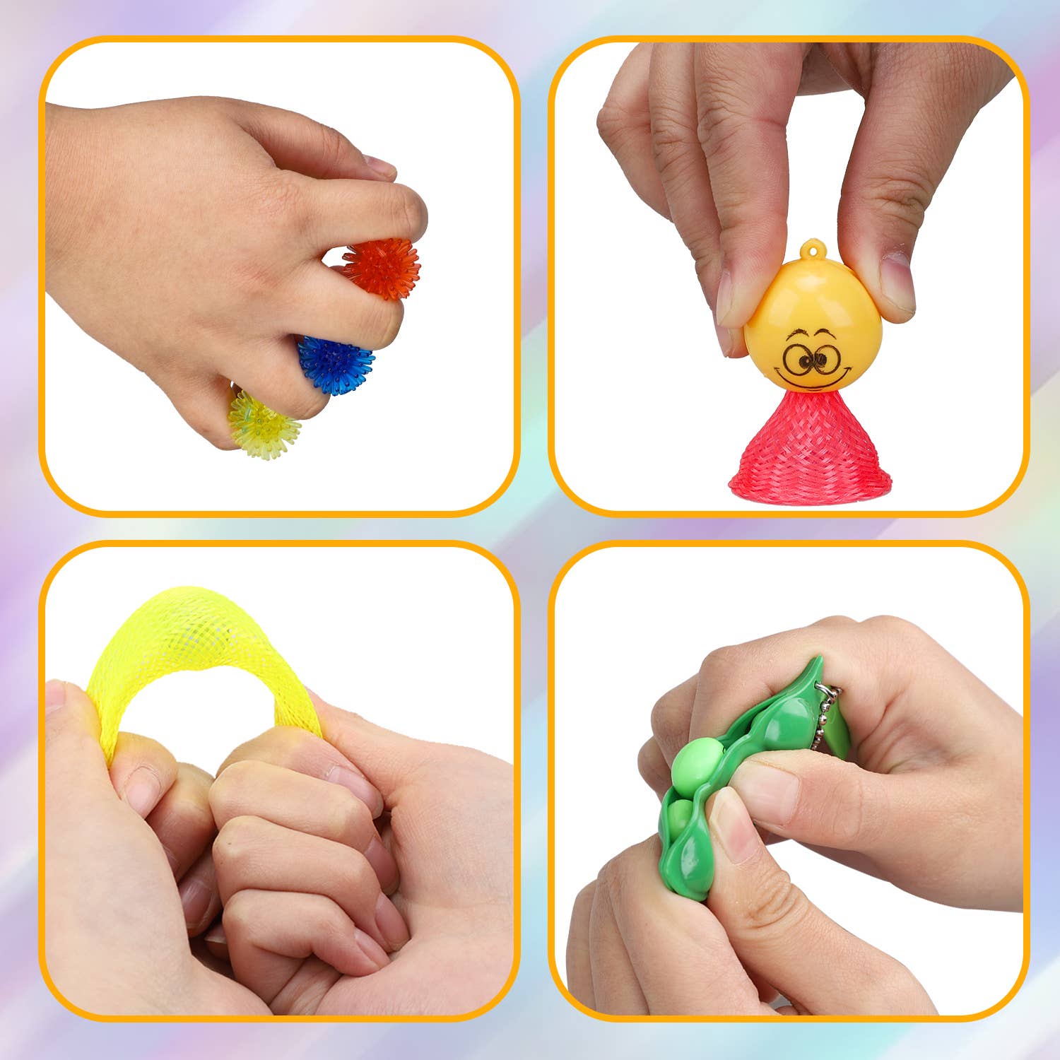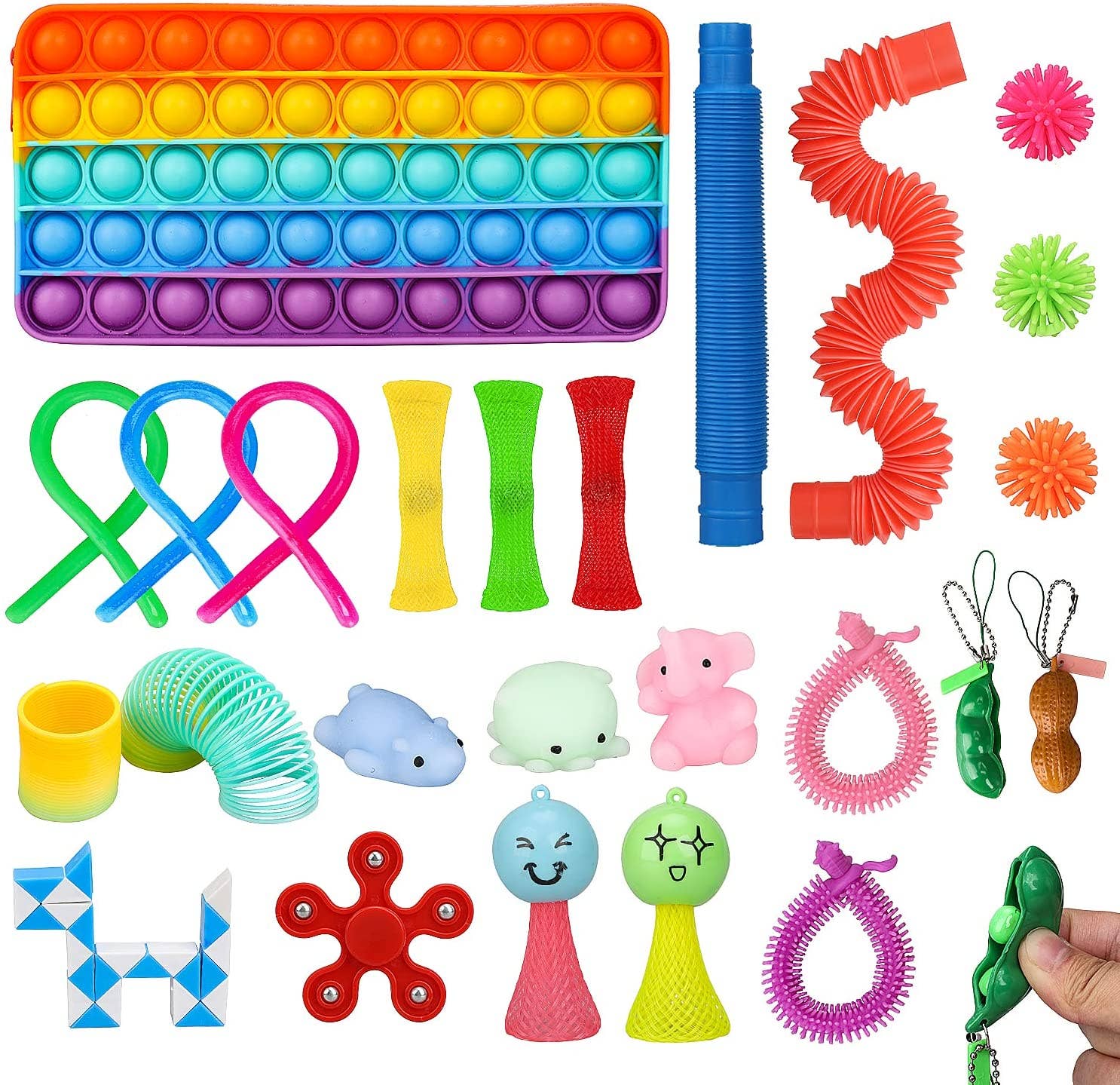 COMES WITH PLENTY OF FIDGETS: Open up this pop bag, and inside you’ll find a whopping 23 different fidgets! Includes squishies, slinkies, a simple fidget spinner, mini massage balls, squeeze-a-bean fidget keychains, and more.