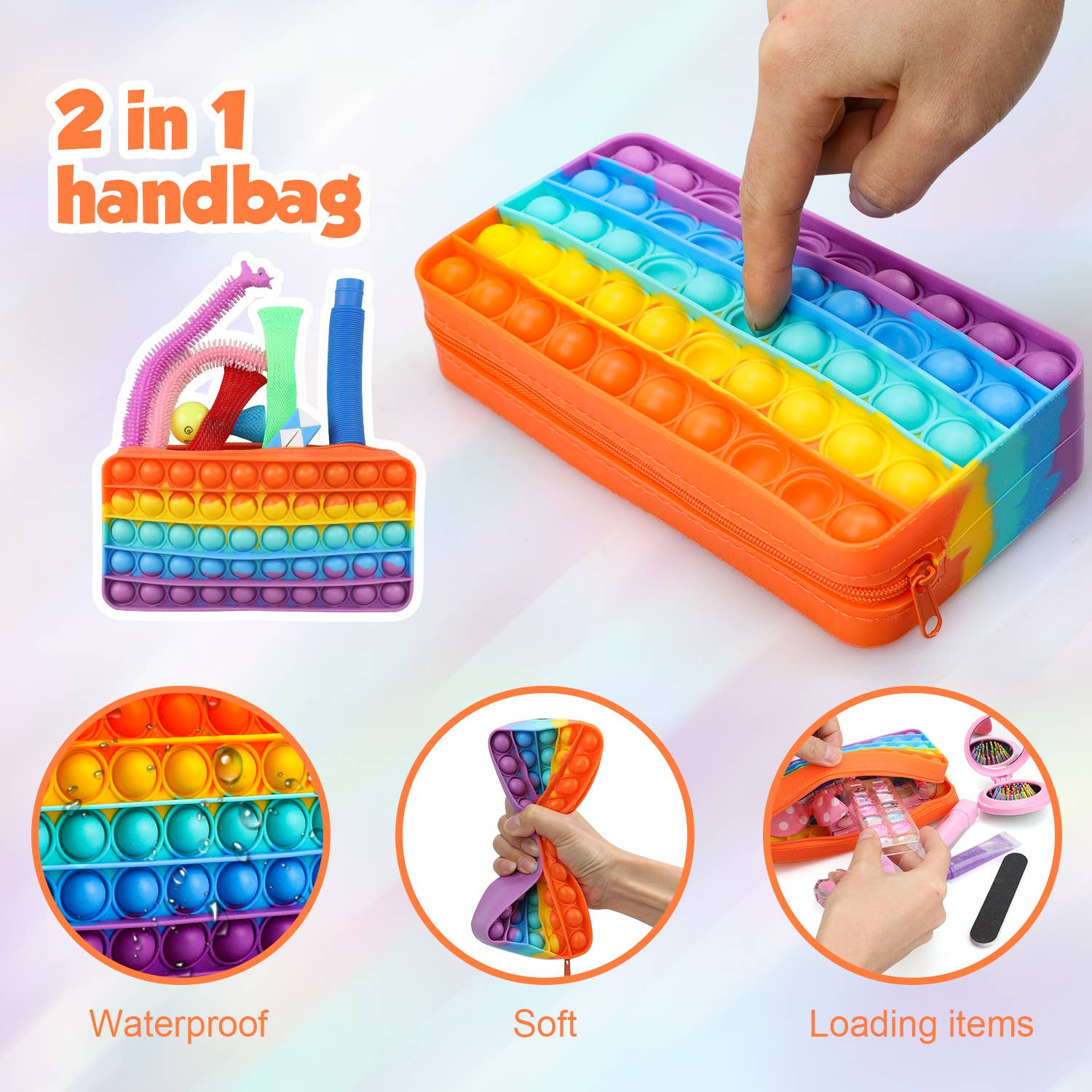 RELIEVE STRESS ON THE GO: If your little one’s getting fidgety, antsy, or stressed, have her bring along this popit purse to feel better! Pop the bubbles on the bag, or reach inside for a fidget toy, anywhere and anytime.